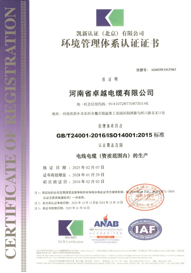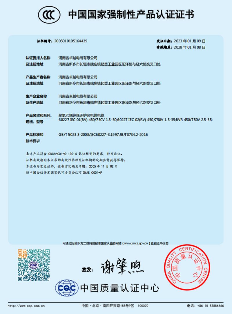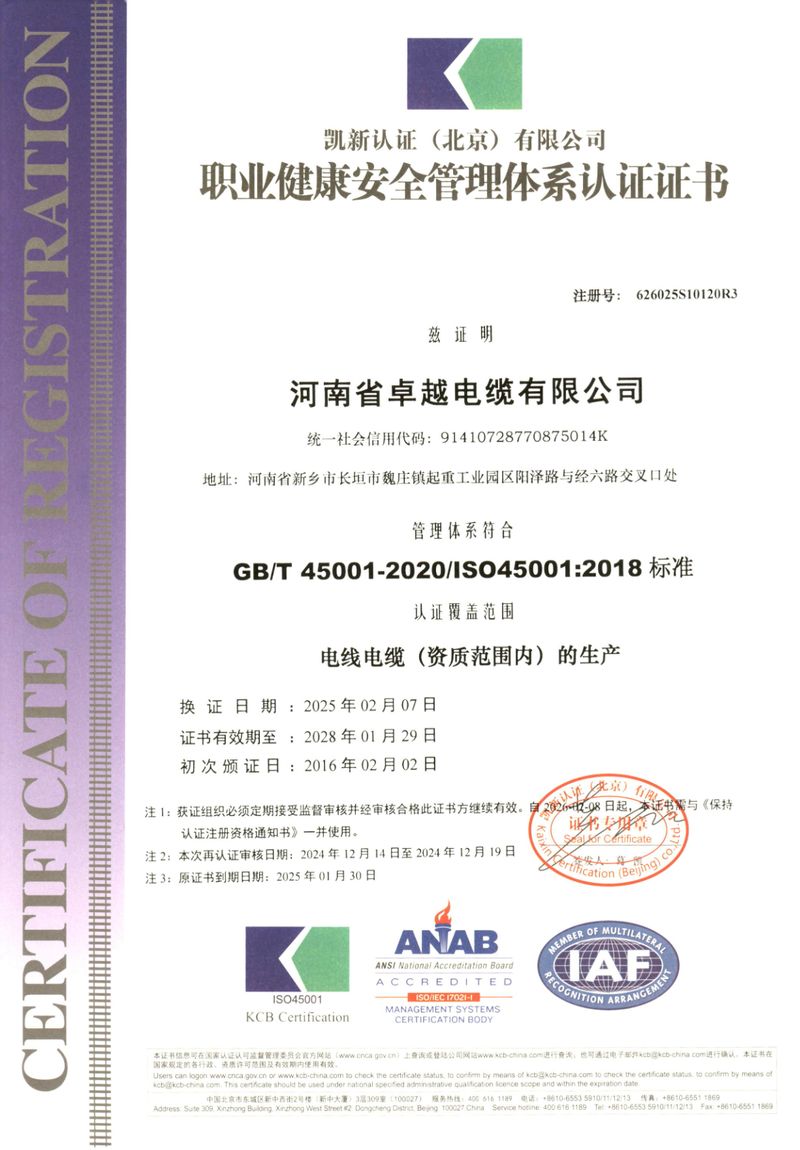 河南省卓越電纜有限公司是一家集生產、研發、銷售、服務為一體的河南省**技術企業,創建于2003年,位于長垣縣起重工業園區,占地面積:54000 m2;總資產12000多萬元,年產值5.2億元;主要產品有:各種型號規格的起重機扁平軟電纜、橡套軟電纜、耐高低溫電纜、聚氯乙絕緣電線電纜、控制電纜、電力電纜、船用電纜、礦用電纜、阻燃及耐火電纜、計算機電纜等;產品廣泛用于起重、鋼鐵、軍事、化工、煤礦、建筑、特種裝備等行業及領域。通過CCC認證、生產許可證、GB/T45001-2020/ISO45001:2018三體系認證等;中國質量萬里行理事單位。并被授予河南省電工行業誠信口碑單位、河南省科技型中小型企業等榮譽稱號,入選“2017年度河南省“專精特新”中小型庫。